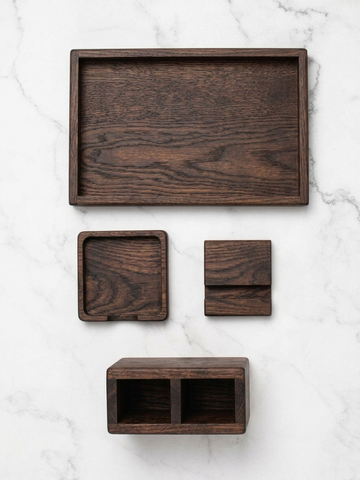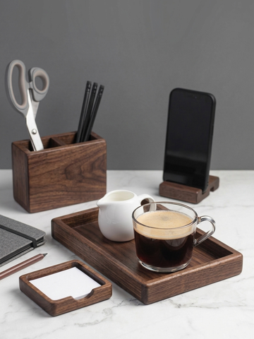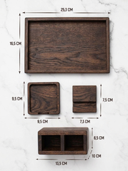 Канцелярский набор выполнен из дуба, обработан натуральным составом на основе льняного масла, пчелиного воска и органических красителей - брутально и стильно! Поднос деревянный можно использовать не только как подставку, но и по прямому назначению. Стиль в мелочах! Чашечка кофе для руководителя и его гостей и день действительно обещает быть добрым)