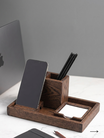 Органайзер для канцелярии настольный. Подарок руководителю, менеджеру, IT-специалисту на день рождение или юбилей. Порядок на рабочем месте дает правильный настрой: пользователь собран и сосредоточен, нужные мелочи всегда под рукой. Для офиса принадлежности включают 4 предмета: органайзер для ручек, подставка для телефона и бумажного блока, поднос декоративный для компактного хранения. Чтобы степлер, скобы и ластик не «захватили» стол!